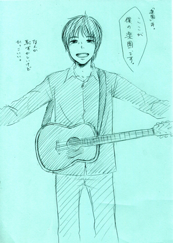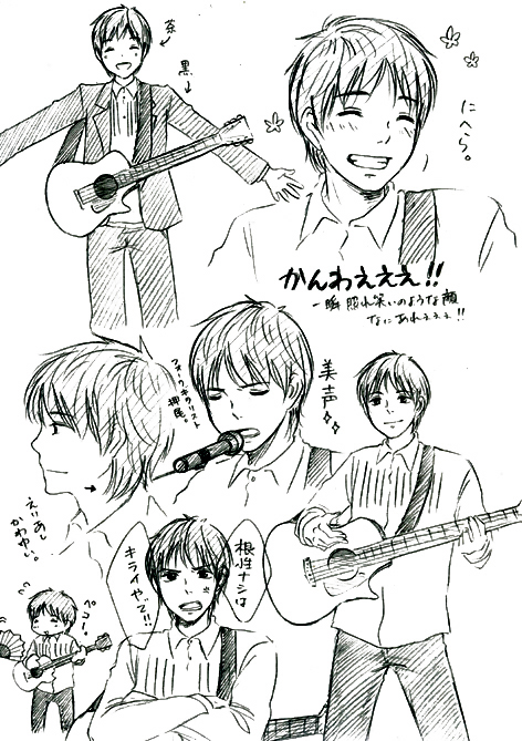 「弾いてると指痛くなるんですよね。指痛いなあ…もうやめちゃおうかなあって思って。したら友だちにバレー部のキャプテンをしていた松尾って人がいたんですが、そいつが『おいギター続けてんのか。』って訊いてきて。『やめたで。だって指めっちゃ痛いねんもん、あんなん俺にはむりむり。』とものすごい根性ナシなこと言ったら松尾がえっらい怒って。『お前何言うてんねん!そんな根性ナシは俺嫌いやぞ!』って。それから毎日松尾が『おい練習してるか。』って訊いてくるんです。してないって言えないから、そんで僕嘘つけないんですよ、すぐ顔に出るから。だからしゃあないから毎日5分だけ練習しようと思って。『おい練習してるか。』『してるよ。』と言えるんでね。そしたらその5分間の積み重ねですよ。今じゃプロとしてギターを弾けるようになりました。松尾君には感謝です。」