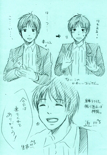 「宇多田ヒカルさんのファーストラブ…これ日本語に訳すと初恋です。初恋っていいですよね。聞くとなんかキュンッとします(←可愛い)。なんかもう字に書いただけで可愛いですよね、は、つ、こ、い、はわああっ!(←超可愛い)男の子より女の子のほうが初恋って早いんですよね。女の子が、あの人かっこいいーとか言ってる間、男の子はカードに夢中なんです。僕も集めてました。プロ野球カードとか大相撲カードとか。それをカードフォルダーに入れて眺めるんですよね。ああ、あとこれとこれだけ集めればコンプリートやな…とか。でもそうしてる内に、中1のときです。なんかこう胸が苦しくなることがあったんです。あれ、何なんやろうこれは…と思って。あのコちょっとかわええな…でもカードも気になるんです。ああでもかわええ…これは友だちに言うべきか言わないべきか。色々悩んで、ラブレターを書くことにしました。(会場どよめき)…ラブレターですよ?メールやないんです。まあメールも似たようなもんかもしれませんが。まず『すきです。』……この次なんて書いたらいいんやろ。好きになった理由を書く?『人目会ったその日から、恋の花咲く…』いやちゃうな。色々悩んでどうにか5、6行に纏めて過ぎの日靴箱に入れたんです。そしたらそれから女の子のほうは返事をくれようとこっちを気にかけてくれてるんですが、僕は返事聞くの怖いからずっと逃げてたんですよね。そんな感じで気付いたら…って感じです。手紙なんか入れなきゃよかったなあと。そんな甘酸っぱい初恋でした。」